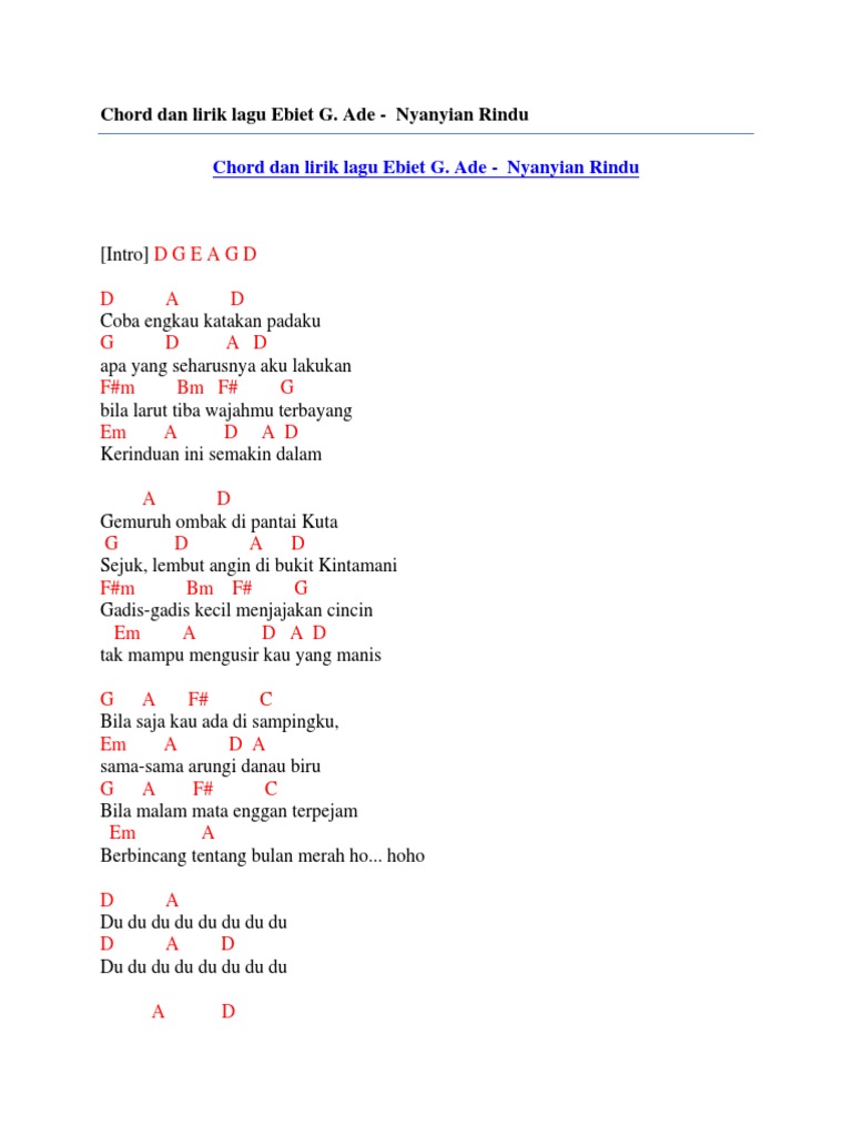 A AC D E Hati ini hanya rindu. Am A menggenggam menahan Dm C segala kerinduan. Setiap hari bertemu G D rindurindu menyayat kalbu Am C Em rindu dan cemburu.