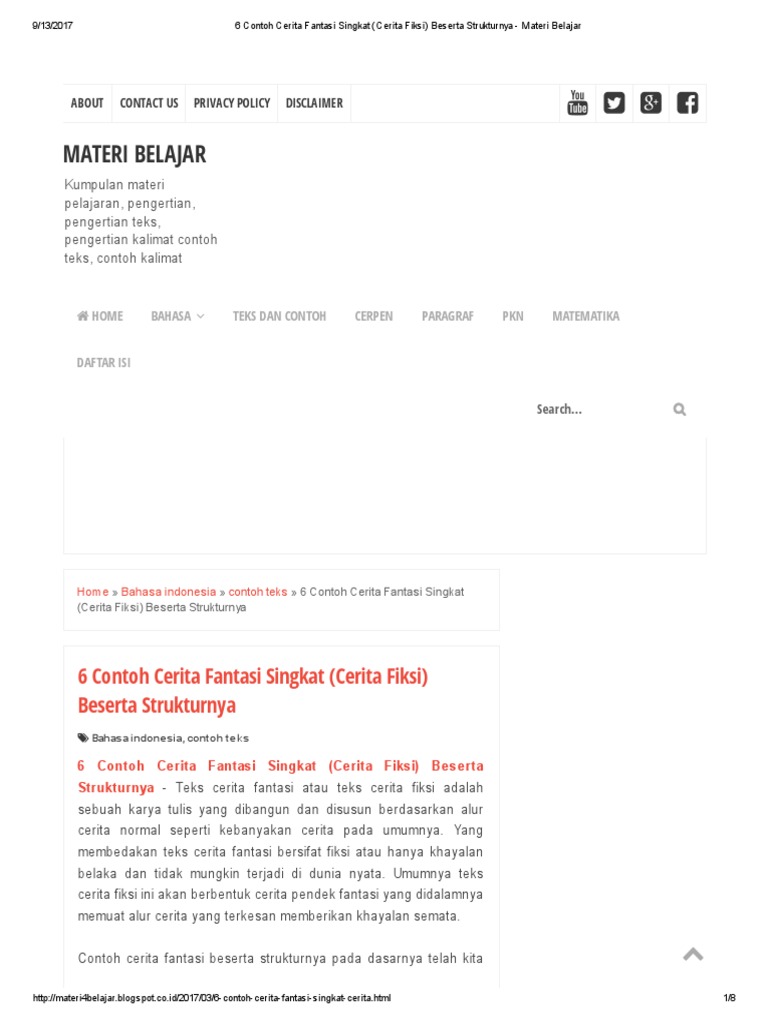 Contoh cerita fiksi pendek 1 paragraf. Contoh Resensi Novel Fiksi Pudarnya Pesona Cleopatra. Beberapa di antaranya adalah tanda baca jenis bacaan hingga seputar jenis-jenis paragraf. Contoh Cerita Fabel Kisah Buaya yang Serakah.
